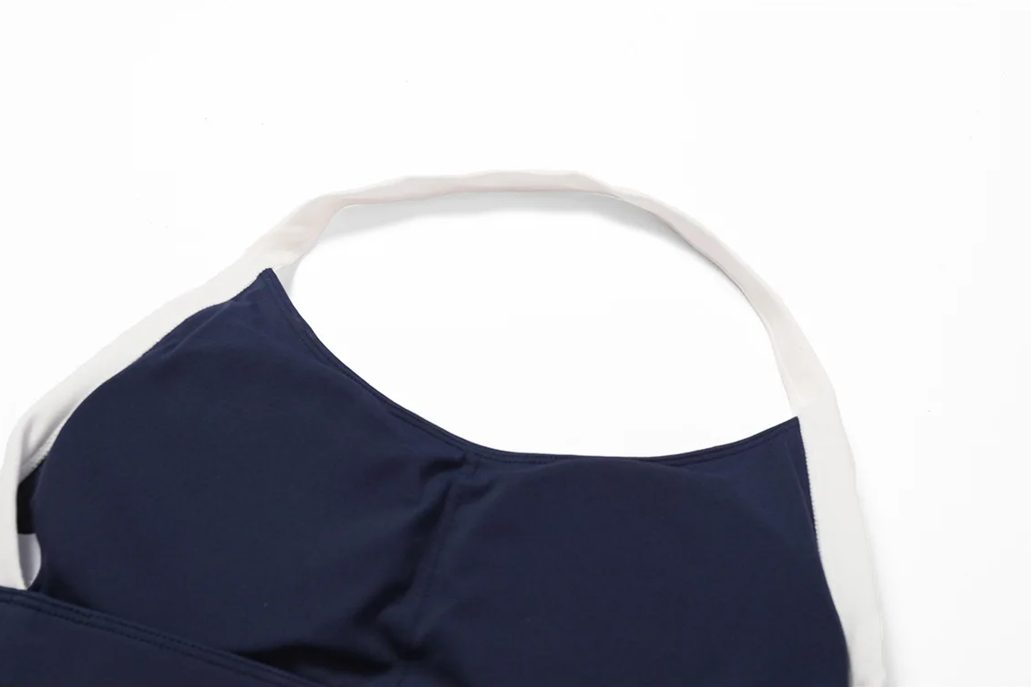 The minimalist halter bra and sculpting high-waisted trousers create a balanced, lightweight silhouette — made for everything from movement to moments.