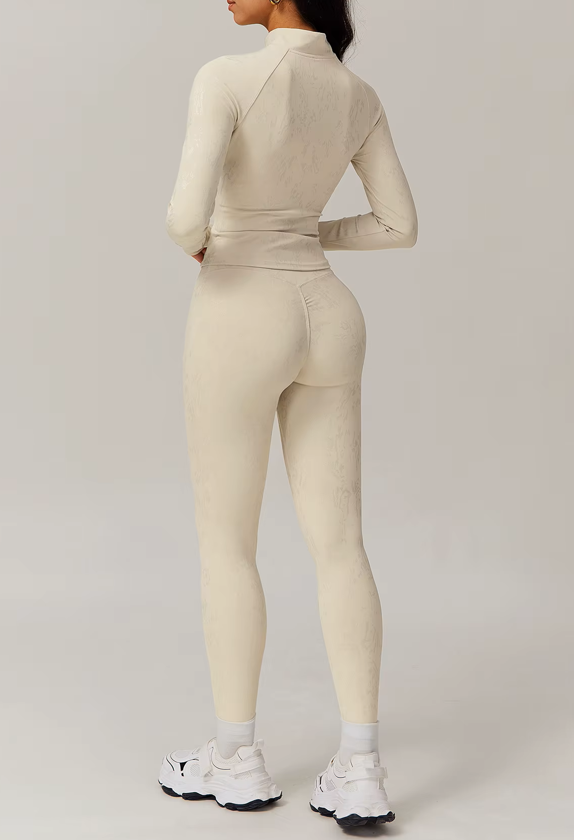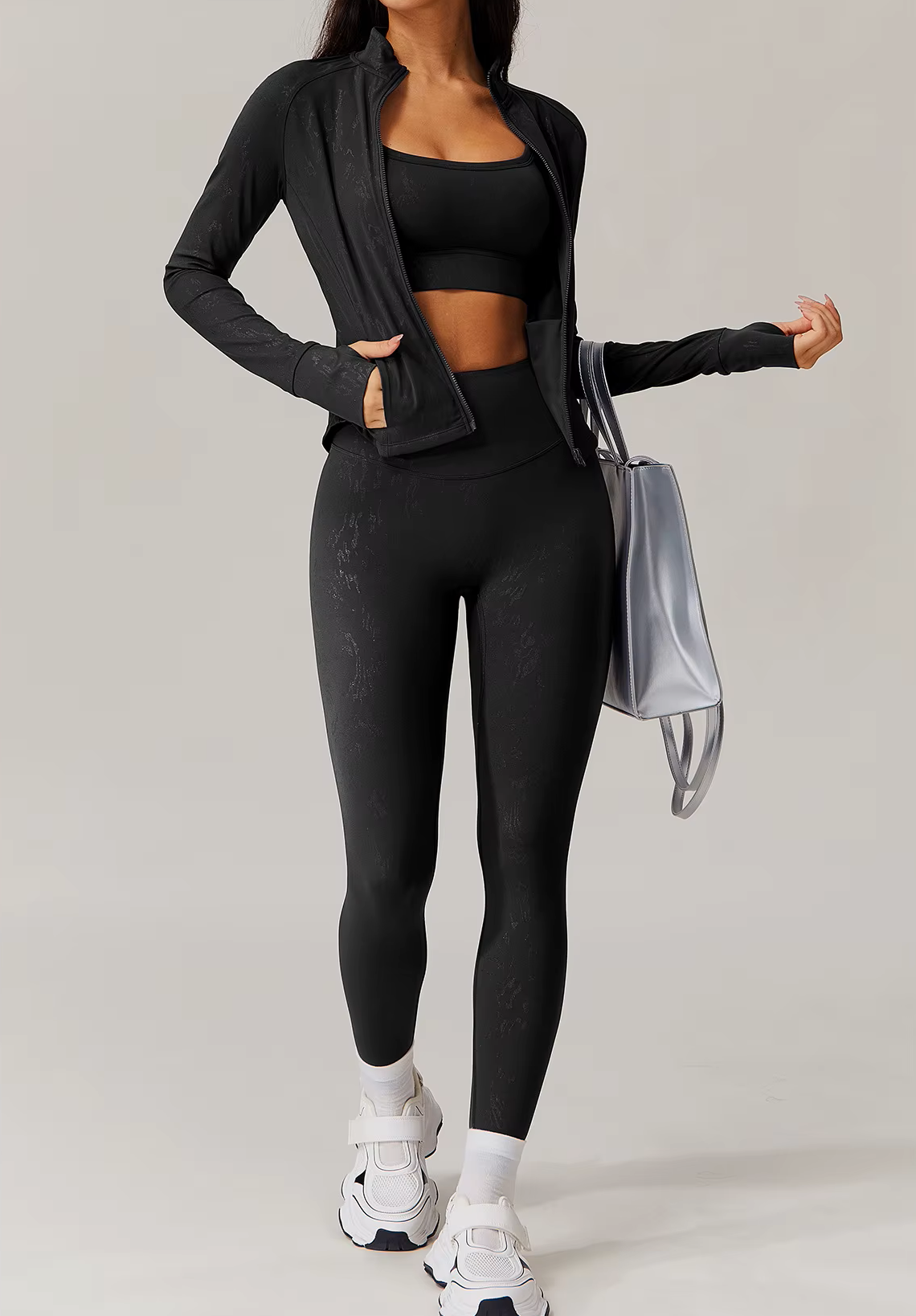 "This set is sleek and sculpting. The jacket zips perfectly and the leggings stay in place all workout."