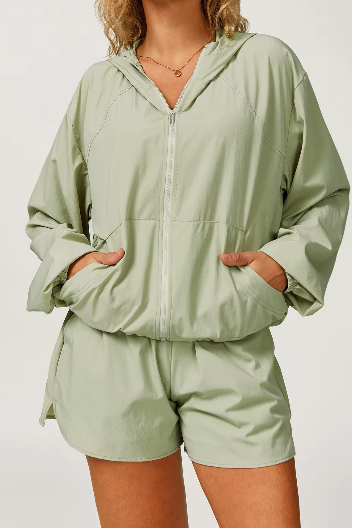 The Aery Jacket features a relaxed fit, full-zip front, and minimalist hood for effortless layering.